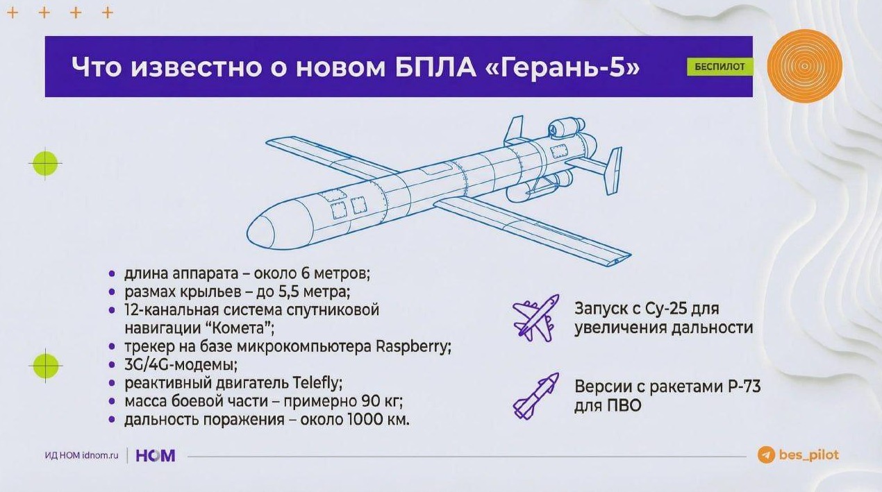 ВС РФ начали применять для ударов по Украине беспилотники "Герань-5" – по крайней мере, так утверждают украинские СМИ со ссылкой на украинские же спецслужбы, пишет телеграм-канал "Беспилот".