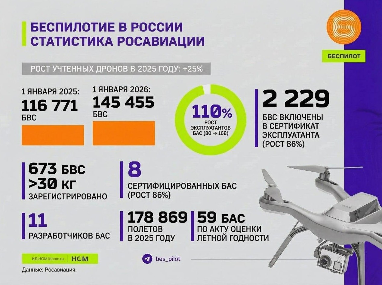 За год эта цифра выросла на 25%, до 145 455 БВС на 1 января 2026 года. Также приведены следующие факты: