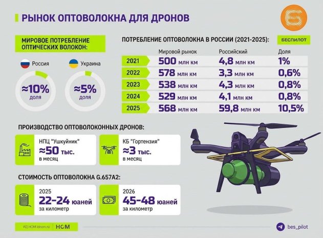 В 2025 году 15% мирового потребления оптических волокон пришлось на российские и украинские дроны, при этом около 10% этого потребления обеспечивала Россия. Телеграм-канал "Беспилот" напомнил, что раньше российский рынок потреблял не более 1% мирового оптоволокна.